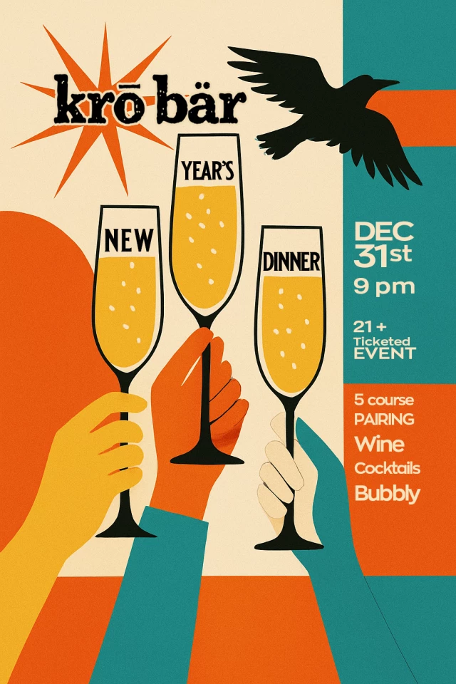 Join us at 9:00 pm for our Annual New Year’s Eve Dinner Bash! Forget the usual New Year's planning—join us for an elevated and unforgettable celebration. Chef Sarah Eubanks-Kohler and "Spiritual Advisor" Cameron MacDonald have truly outdone themselves this year! You'll enjoy a perfectly-paired 5 Course Dinner until the clock strikes midnight!